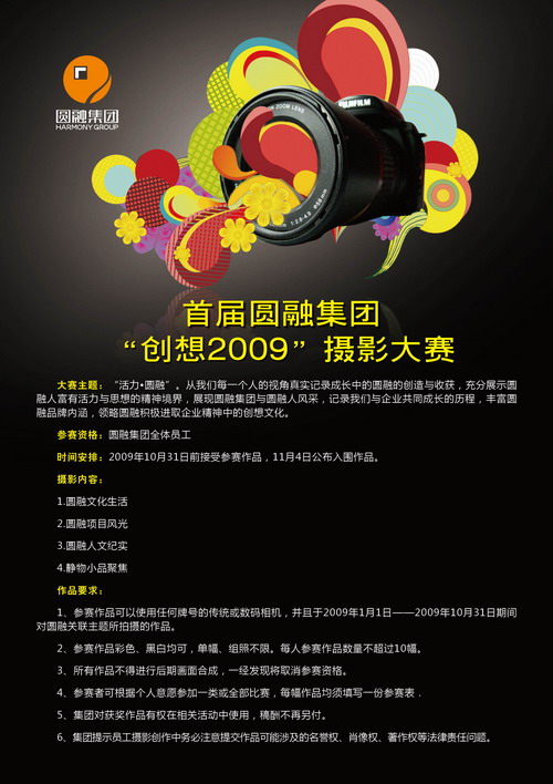 为充分展示圆融人富有活力与思想的精神境界,记录我们与企业共同成长的历程,丰富圆融品牌内涵,领略圆融积极进取企业精神中的创想文化,特举办首届圆融集团员工“创想2009”摄影大赛。