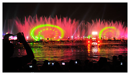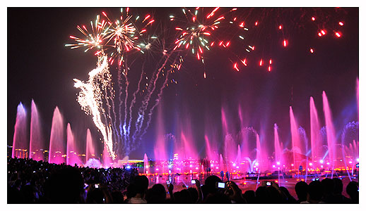 晚上7点左右,当所有的路灯以及景观灯打开,园区披上了一层靓丽的外衣,绽放属于洋苏州的独特魅力。为了庆祝祖国六十华诞,金鸡湖更是开启了水景焰火。在激昂的音乐中,喷泉随着节奏汹或高或低,伴随着轰隆的礼花声,整个湖面像笼上了一层绚丽的外衣,让在城市广场观看水景的数万人为之震撼。