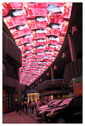 华灯初上,圆融时代广场的天幕准时开启,和平时播放的内容不同,500米长的世界第一天幕上同步转播了国庆晚会。