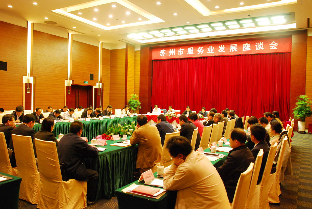 11月11日下午,苏州市服务业发展座谈会在苏州市会议中心多功能厅召开。市委副书记、市长阎立及苏州市各区、各局、委、办主要负责人约70人出席会议,会议由市委常委、副市长周伟强主持。市发改委、贸易局、旅游局、银监分局、保险行业协会、担保商会、百货同业公会、东方丝绸市场、苏州青旅以及苏州工业园区圆融集团做会议交流发言。