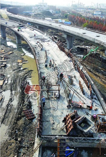 北环快速路东延二期工程高架桥结构形式除跨铁路地段用预制箱梁外,其余均采用3跨~5跨现浇箱梁。主要工程量有:桩基3248根、承台588座、墩身894根、箱梁173联,需用砼60万m3,钢筋6.5万T,土方填筑27.7万方。自今年2月26日开工以来,工程已完成钻孔灌注桩、承台、墩身,箱梁完成126联占总量的73%,护栏完成1284延米,桥面完成32244平方米,土方填筑完成8万方,预计春节前可完成全部箱梁以及地面道路20万方的土方施工。