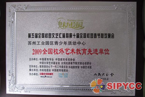 由中国教育学会、中国教育电视协会、中国文学艺术基金会、全国校园春节联欢晚会组委会共同主办的“魅力校园”第十届全国校园春节联欢晚会日前在北京举行。从全国30多个省市300多个送审节目中初评出来的一、二等奖精选优秀节目,参加了赴京汇演。“圆融·花季”艺术团艺术总监高菊珍老师创编的少儿情景舞蹈《三字经》在汇演活动中荣获金奖,园区青少年活动中心同时获得“2009年度全国校外艺术教育先进单位”称号。这也是园区青少年活动中心“圆融·花季”艺术团成立六个月来首获全国大奖。
