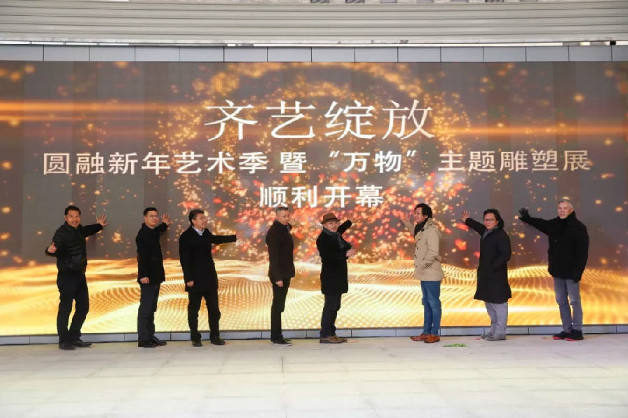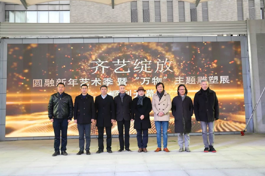 随后中国雕塑院副院长郅敏,中国美术家协会壁画艺术委员会秘书长齐喆,著名评论家、上海大学美术学院教授李晓峰,苏州市美术家协会副主席黄海,圆融集团副总裁沈玉林,圆融集团副总裁张立刚,圆融艺术中心主任薛文岗,明美术馆馆长杨辉一同上台点亮大屏幕,“齐艺绽放”圆融新年艺术季暨“万物”主题雕塑展正式开启。