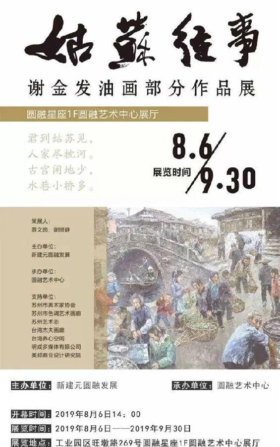 在中华人民共和国成立70周年,苏州工业园区开发建设25周年之际,8月6日由新建元圆融发展主办、圆融艺术中心承办的:“姑苏往事”谢金发油画作品展,在圆融艺术中心展厅隆重举办。谢金发老师带着他和他的作品,向苏州人民展示隽刻在时光里的印记,以此致谢苏城以及对家乡深深的情怀。