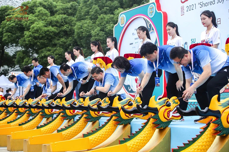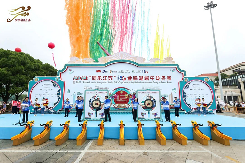2021年6月14日上午,2021“同乐江苏”中国电信“hello 5G”杯金鸡湖端午龙舟赛在新建元·圆融发展旗下商旅文项目月光码头擂鼓启航。本届赛事由江苏省人民政府新闻办公室指导,苏州市委宣传部、苏州市体育局、园区管委会主办,新建元控股集团(圆融体育)承办。