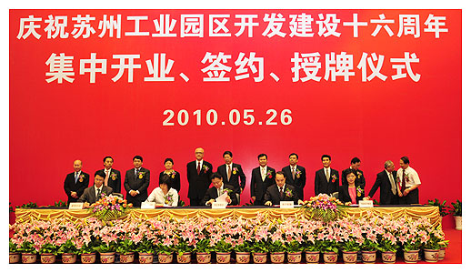 5月26日,中国新加坡合作苏州工业园区开发建设16周年暨新产业项目集中开约、签约、授牌仪式在现代大厦举行。鼎汗、晨辉、神龙航空等8家科技企业同时开业;台湾诚品书店、苏宁电器物流配送中心等多个重大服务业正式签约;江苏省创新园区、江苏省苏州工业园区节能环保科技产业园、江苏省苏州工业园区生物医药科技产业园和江苏省苏州工业园区融合通信科技产业园等4大省级科技园区同时授牌。