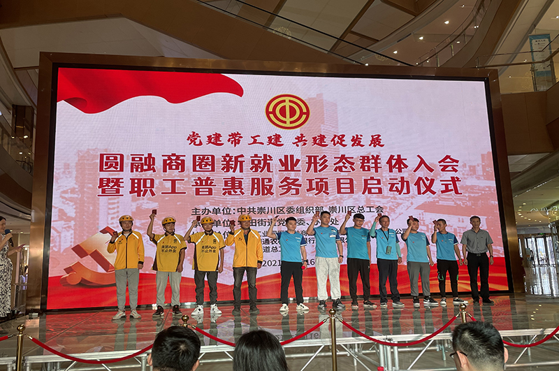 新技术、新经济、新平台催生了新就业形态的蓬勃发展。为保障新就业形态职工合法权益,促进新就业形态良性发展,9月16日下午,由中共崇川区委组织部、崇川区总工会牵头组织、南通圆融广场协办的圆融商圈新就业形态劳动者入会暨“美好会家”普惠服务项目启动仪式在南通圆融广场举行,通过创新多样化服务模式,真正实现职工普惠服务的全覆盖。