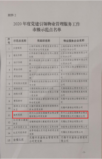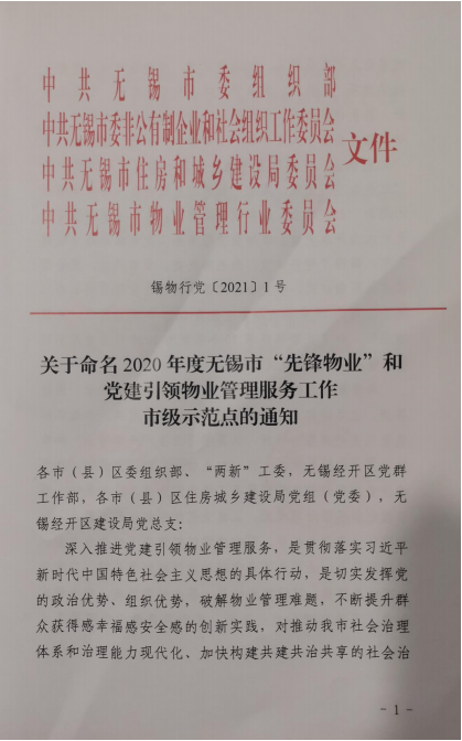 12月16日,圆融商管无锡分公司喜获中共无锡市委组织部、中共无锡市委非公有制企业和社会组织工作委员会、中共无锡市住房和城乡建设局委员会、中共无锡市物业管理行业委员会授予的“2020年度党建引领物业管理服务工作市级示范点”荣誉称号,成为无锡市党建引领物业管理项目的先进标杆。