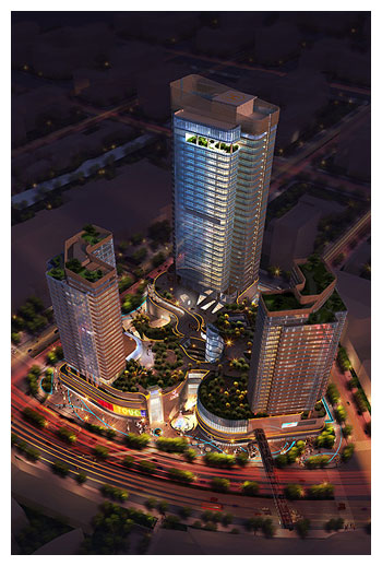 继大型商业综合体——圆融时代广场开创苏州区域商业地产诸多第一,滨水景观商业休闲街区——李公堤成为苏州首个“国字号”中国特色商业街之后,在此次年会上亮相的圆融集团新一代产品——圆融星座,成为专家、同行和媒体关注的亮点。圆融星座项目定位为CBD国际级生态坡地都市综合体,集商业零售、商务办公、湖景公寓等多种业态于一体。其独特的建筑设计,包含了空中花园、屋顶绿植、山地岩壁,瀑布露台、生态坡地等景观。6万平方米的裙楼商业区域采用了新奇的“峡谷”形态和“台地”概念,采用层层退台与屋顶绿化的处理方式,创造更多有层次感的绿地空间;5.8万平方米的精装湖景公寓,形体设计注重与整个建筑群体“峡谷”意向的呼应,建筑形态灵动,居住其中可一览金鸡湖的繁华与美丽;写字楼则采用了明快的体量变化与简洁的虚实对比手法,并引入了绿色建筑的设计概念,在品质上以超越甲级水准为目标,将服务于国际性多元化的企业客户。预计于2013年建成的圆融星座,必将为久居喧嚣都市的人们提供独具魅力的、自然生态式的、全新生活方式和消费体验;将会成为下一代城市综合体的引领者和新标杆。