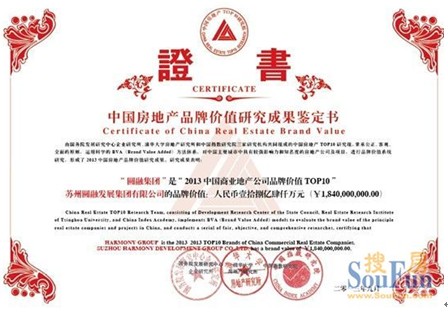 在2013中国房地产品牌价值研究成果发布会上,圆融集团以18.40亿元的品牌估值获“2013中国商业地产公司品牌价值TOP10”称号,其开发的圆融(时代)广场荣获“2013中国商业地产项目品牌价值TOP10”称号。这是圆融集团及圆融(时代)广场自2011年以来连续第三年获此荣誉,且在TOP10榜单中名次逐年提升。