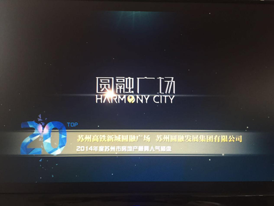 2015年8月14日,由苏州统计局、住建局、房协共同主办的“2014年度苏州房地产开发综合实力20强企业颁奖典礼”在金鸡湖大酒店独墅湖厅盛大开启。市政府相关领导、市房协领导、各房企代表等出席盛典,为20家脱颖而出的顶级房企颁发荣誉称号,并揭晓了由找房通全媒体平台评选出的苏州房地产品牌影响力楼盘。圆融集团荣获“2014年度苏州最佳城市运营典范企业” 特别奖,苏州高铁新城圆融广场摘得“2014年度苏州最具人气楼盘”桂冠。