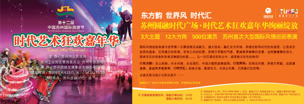 4月25日下午,作为第12届苏州国际旅游节点睛活动之一的“时代艺术狂欢嘉年华”将在位于苏州金鸡湖东的圆融时代广场隆重开幕。届时,携带国内外时尚艺术元素的精彩演出将登陆圆融时代广场,为苏州市民、外地甚至国外游客开启一场令人眩目的艺术狂欢盛宴。